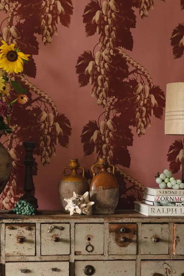 Här möts klassisk elegans och en lättsam, fantasifull känsla. Tapeten tillför en sofistikerad atmosfär samtidigt som den ger rummet personlighet och glädje.