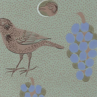 Ritva Kronlunds stormönstrade fågeltapet Avaruuslintu är en tidlös designklassiker från 1970-talet. Tapeten passar i matsal, vardagsrum eller hall.