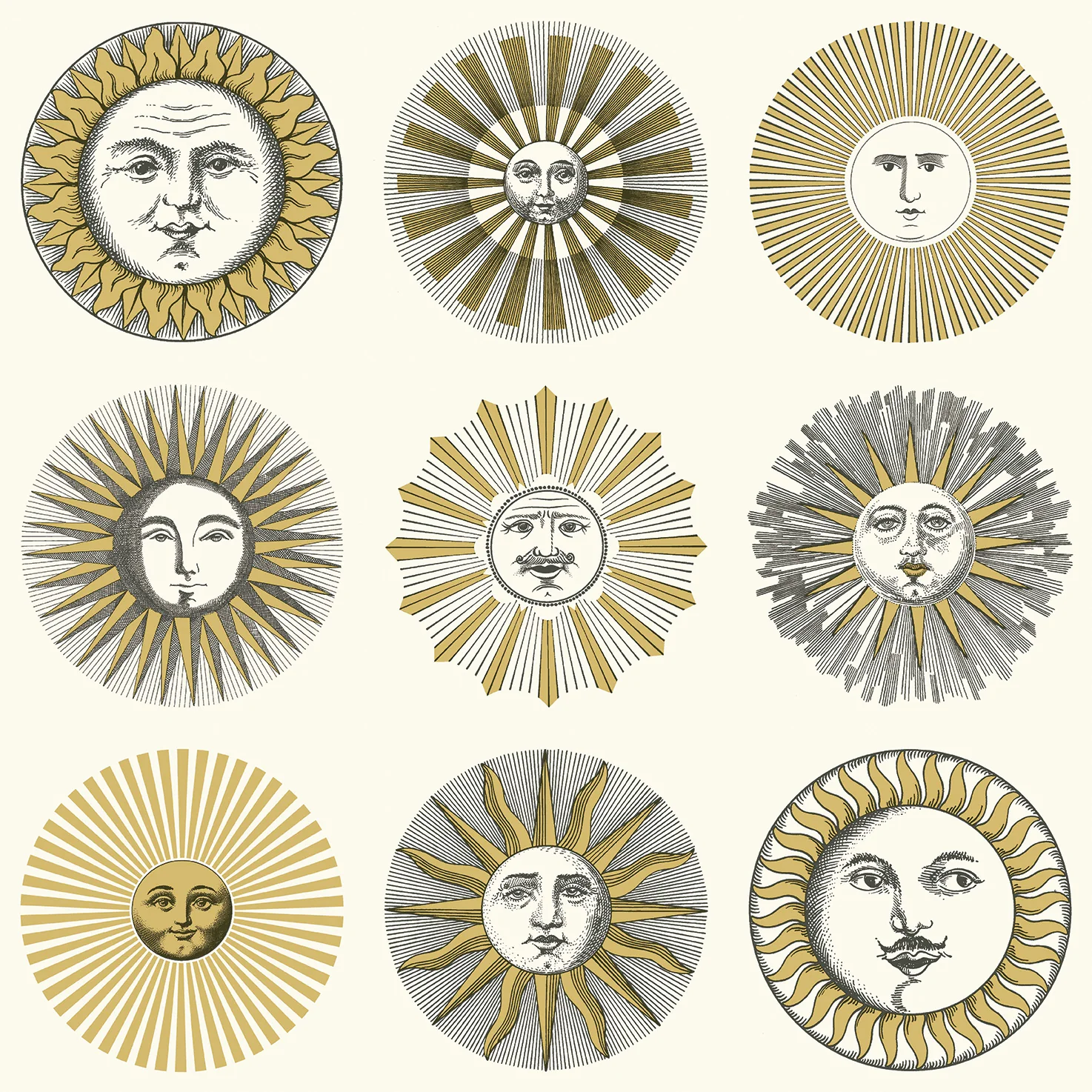 Fornasettis ateljés Sol-tapet är en riktig klassiker. Solen har fått en privilegierad plats bland naturliga former och är ett av ateljéns huvudmotiv i dess visuella universum. Detta intresse härstammar från början av 1940-talet, när Gio Ponti på begäran bad Piero Fornasetti att designa almanackor med ett måntema som julklappar. Tapeten passar perfekt i hemmet i många olika rum.