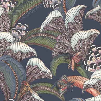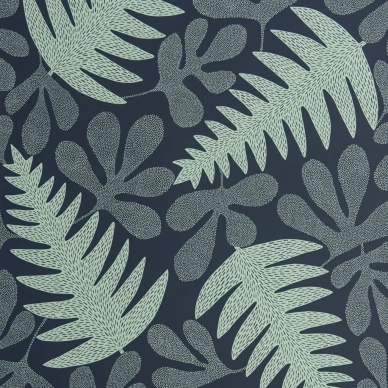 Grafiska tapeten Zulu Terrain med fjädrar och löv har inspirerats av de böljande kullarna och dalarna kring Ardmorefarmen i provinsen KwaZulu Natal i Sydafrika. Den tätt mönstrade tapeten signalerar vitalitet och fruktsamhet. En vacker sovrumstapet eller vardagsrumstapet.