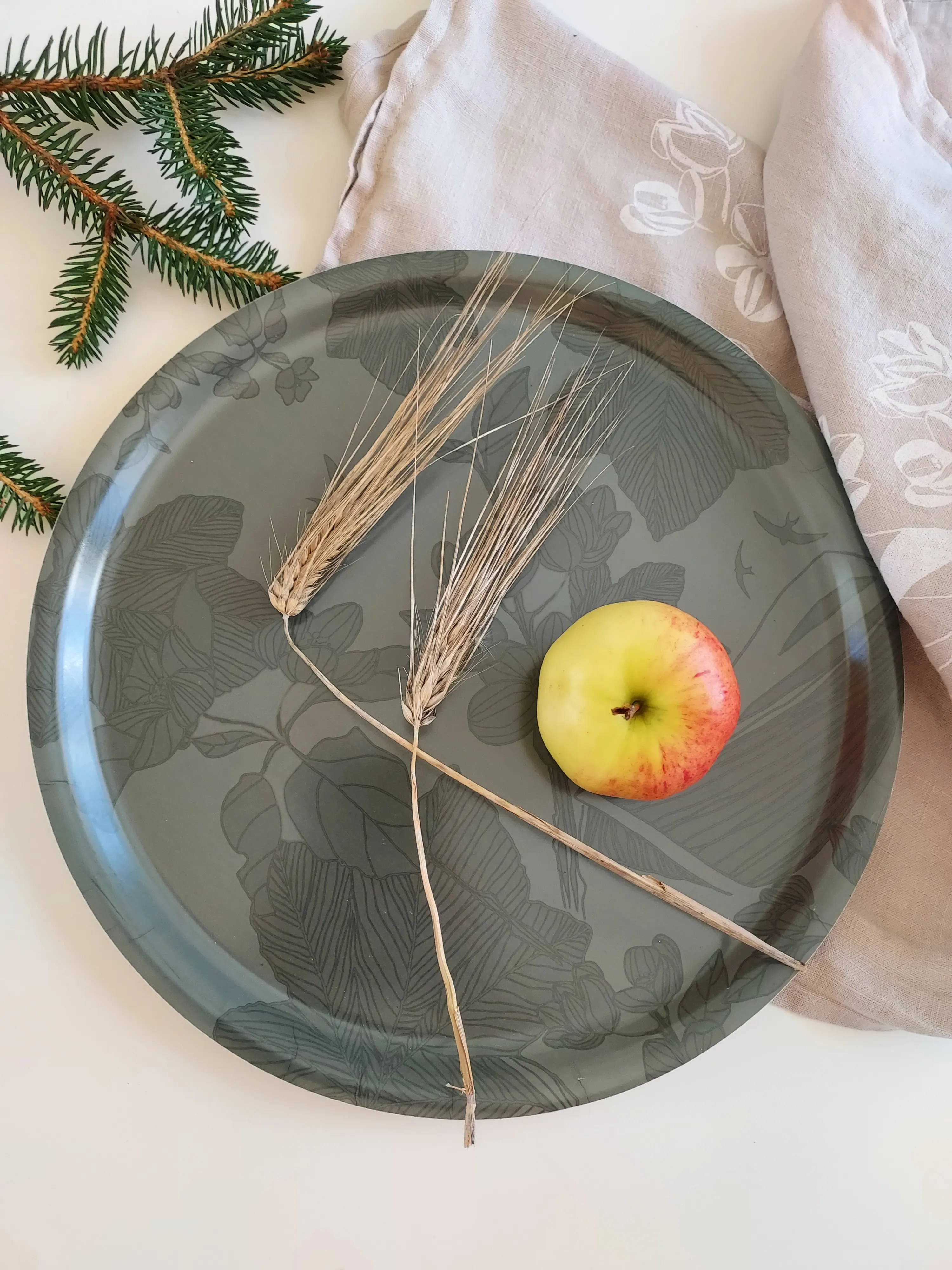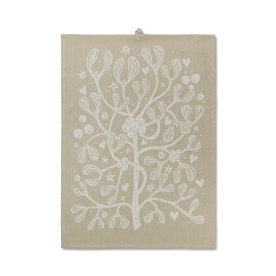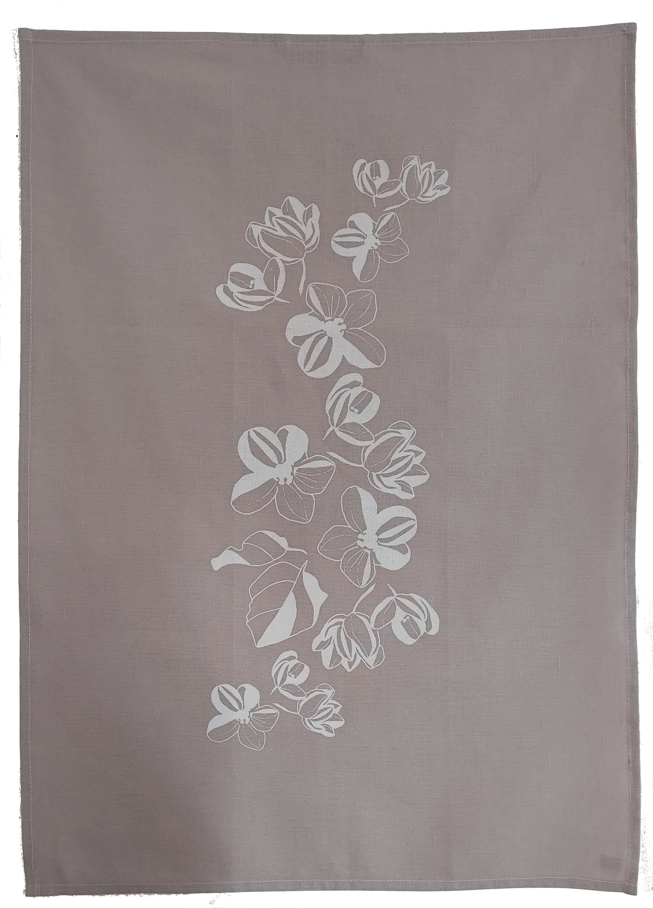 Varmgrå kökshandduken Äppelblom i linne passar bra ihop med de nya Österbottenbrickrna Rost, Salvia och Dimblå. Den matchar även Johannabrickan med dess äppelblommor. Handduken passar alla säsonger, såväl jul som sommar, och har en harmonisk konstellation av äppelblommor med inspiration från övriga Österbottenbrickor.