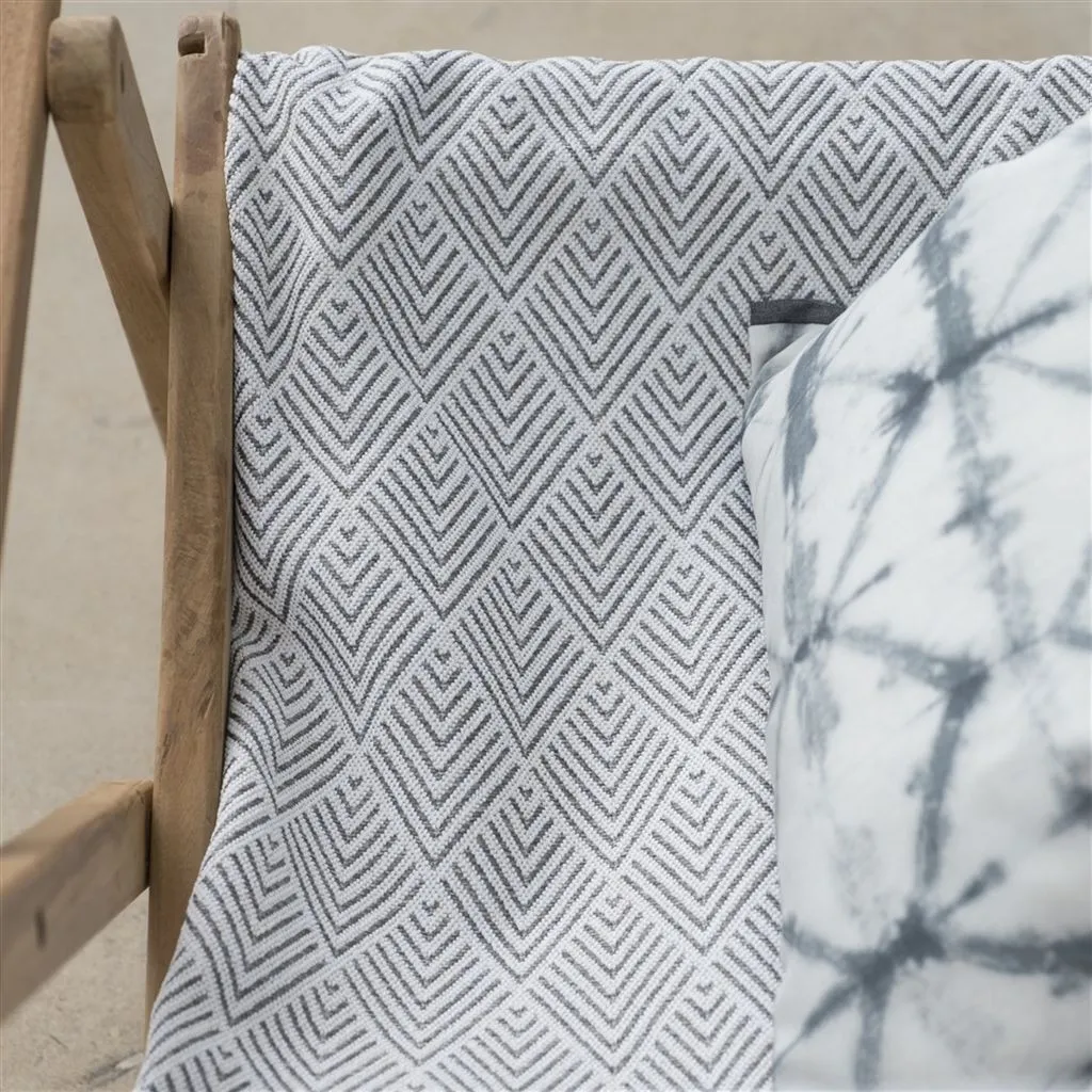 Designers Guild Balian tygets material är polypropylen. Färgpaletten är ljus med sofistikerade neutrala färger. Lämplig för användning utomhus på kuddar och stolar.
