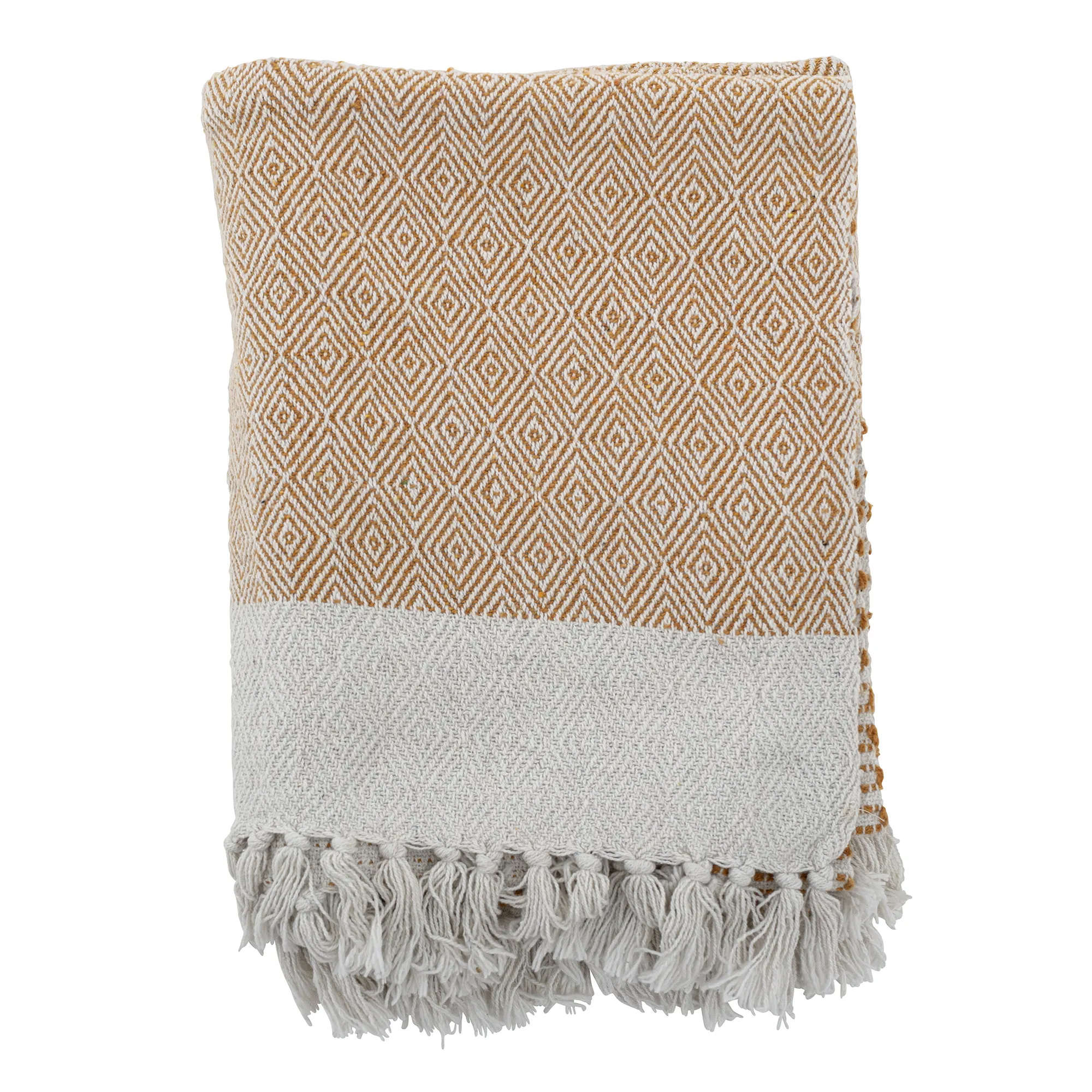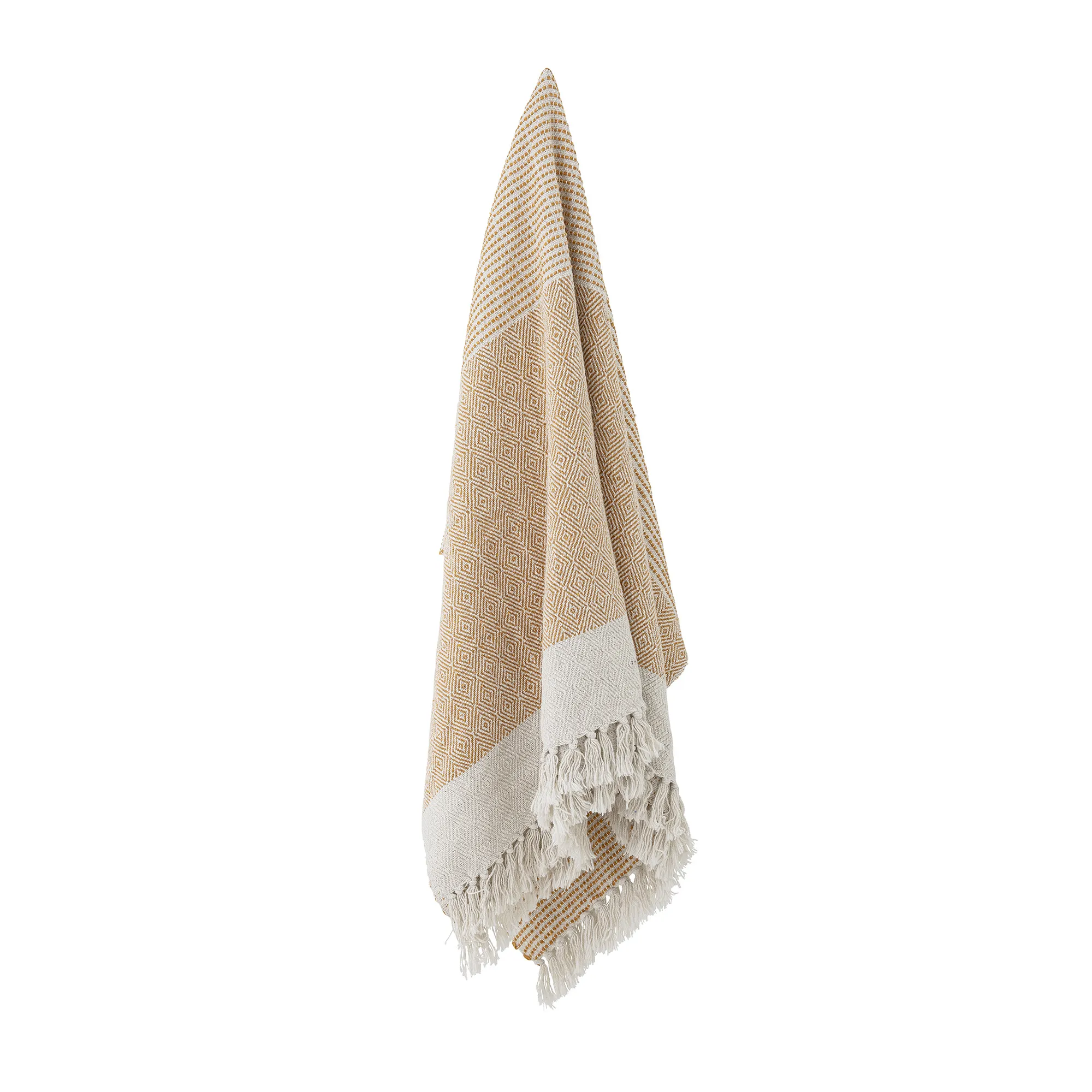 Bloomingvilles gul-vita salmiaksrutiga filt Demi är härligt skön att krypa under i soffan när du känner dig frusen. Filten är tillverkad av återanvänd bomull. En fin filt till vardagsrumssoffan, sängen eller balkongen.