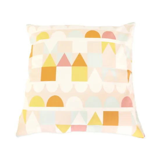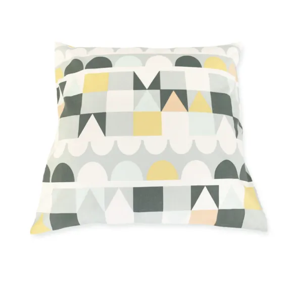 Majvillans kuddfordral Tivoli med geometriskt mönster i milda färger fås i två färgalternativ.